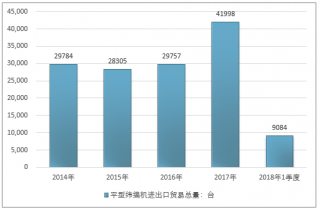 2016年我国平型纬编机进出口贸易总量29757台,2017年进出口贸易总量41998台;2018年1季度进出口贸易总量9084台。