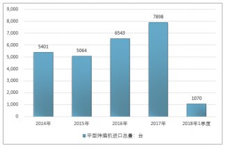 2016年我国平型纬编机进口总量6543台,2017年进口总量7898台;2018年1季度进口总量1070台。