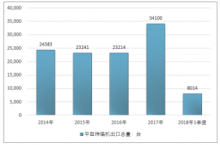 2016年我国平型纬编机出口总量23214台,2017年出口总量34100台;2018年1季度出口总量8014台。