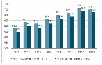 2011-2018年中国包装纸消费量和产量数据走势图(单位:万吨)