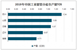 从各省市工业雷管产量来看,2019年,中国工业雷管产量排名前五的省份分别是四川省、山西省、云南省、辽宁省、湖南省,产量分别为1.34亿发、1.09亿发、1.07亿发、0.87亿发、0.71亿发,五省合计产量达5.08亿发。