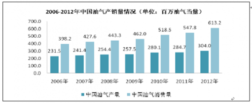 经过三十多年的高速发展,我国已成为全球第二大经济体,能源需求与日俱增,现已成为全世界第二大石油消费国。自上世纪90 年代我国成为石油净进口国以来,石油进口量连年攀升,2012 年我国石油净进口量达2.84 亿吨,天然气进口428 亿立方米,油气供需缺口巨大。