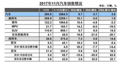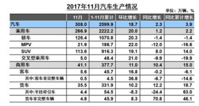 2017年11月,汽车生产308.03万辆,环比增长18.69%,同比增长2.31%;销售295.76万辆,环比增长9.73%,同比增长0.65%。1-11月,汽车产销2599.88万辆和2584.49万辆,同比增长3.88%和3.59%,增速比1-10月减缓0.39个百分点和0.54个百分点。