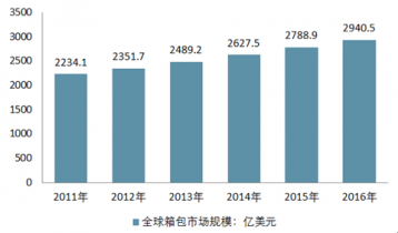 2011-2016年全球箱包市场规模走势图(单位:亿美元) |