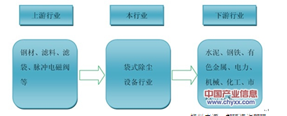 袋式除尘器行业的上游为钢材、滤料、滤袋和脉冲电磁阀等生产制造业,下游主要是水泥、钢铁、有色金属、电力、机械、化工、市政等行业的最终用户。钢材、滤料和滤袋等主要原材料价格波动直接影响袋式除尘设备的生产成本,水泥、钢铁、有色金属、电力、机械、化工、市政等行业的发展决定了袋式除尘器产品的未来需求。