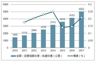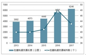 截止2017年,我国运营的轨道交通线路达5022公里,同比增长20.9%,近五年的CAGR达到19.5%;在建轨道交通的城市有43个,在建长度达6246公里。