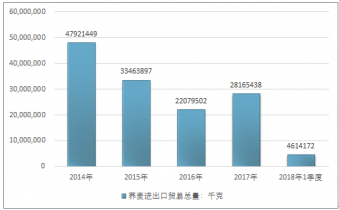2016年我国荞麦进出口贸易总量22079502千克,2017年进出口贸易总量28165438千克;2019年1季度进出口贸易总量4614172千克。