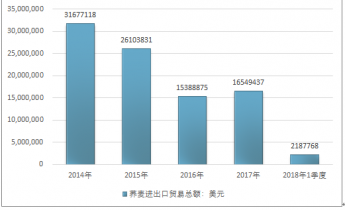 2016年我国荞麦进出口贸易总额15388875美元,2017年进出口贸易总额16549437美元;2019年1季度进出口贸易总额2187768美元。