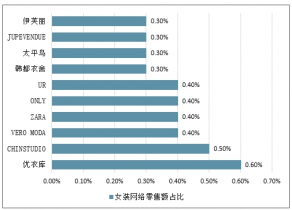 2019年3月女装网络零售TOP10品牌分别是:优衣库、CHINSTUDIO、VERO MODA、ZARA、ONLY、UR、韩都衣舍、太平鸟、JUPEVENDUE、伊芙丽。其中,优衣库品牌女装市场占比最大,3月其网络零售市场份额占比达到0.6%。其次,CHINSTUDIO品牌女装则位居第二,占比为0.5%。