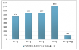 2016年我国机动混凝土搅拌车进出口贸易总量6499辆 ,2017年进出口贸易总量8204辆 ;2019年1季度进出口贸易总量968辆 。