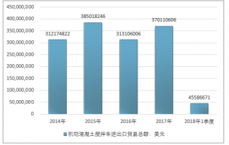2016年我国机动混凝土搅拌车进出口贸易总额313106006美元,2017年进出口贸易总额370110606美元;2019年1季度进出口贸易总额45586671美元。