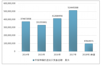 2016年我国平型纬编机进出口贸易总额412684956美元,2017年进出口贸易总额514445368美元;2018年1季度进出口贸易总额97819571美元。
