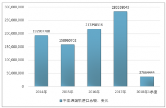 2016年我国平型纬编机进口总额217398316美元,2017年进口总额283538043美元;2018年1季度进口总额37664444美元。