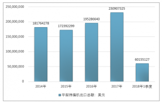 2016年我国平型纬编机出口总额195286640美元,2017年出口总额230907325美元;2018年1季度出口总额60155127美元。
