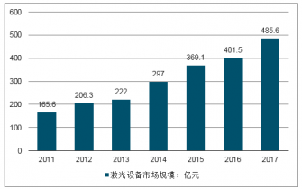 2010年以来,得益于应用市场的不断拓展,中国激光产业也逐渐驶入高速发展期。在经过2015年增速放缓后,整个市场又重新驶入快车道。2016年,在工业、信息、商业、医用和科研领域的激光设备(含进口)市场销售总收入高达385亿元,较2015年同比增长了12个百分点, 2017年中国激光设备市场销售总收入约462亿元。