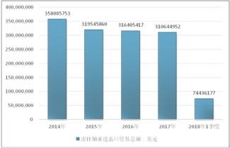 2016年我国滚针轴承进出口贸易总额316405417美元,2017年进出口贸易总额310644952美元;2018年1季度进出口贸易总额74436177美元。