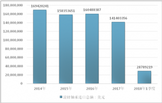 2016年我国滚针轴承进口总额160488387美元,2017年进口总额141403356美元;2018年1季度进口总额28789219美元。