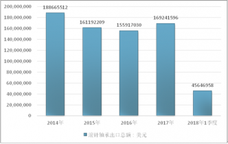 2016年我国滚针轴承出口总额155917030美元,2017年出口总额169241596美元;2018年1季度出口总额45646958美元。