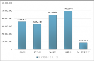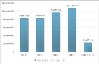 2016年我国减压阀进出口贸易总量96959160套 ,2017年进出口贸易总量107720457套 ;2018年1季度进出口贸易总量22665126套 。