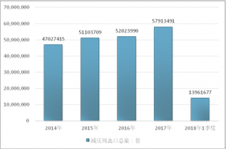 2016年我国减压阀出口总量52023990套,2017年出口总量57913491套;2018年1季度出口总量13961677套。