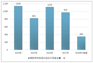 2016年我国磁粉探伤检测仪进出口贸易总量1114台,2017年进出口贸易总量974台;2018年1季度进出口贸易总量345台。