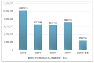 2016年我国磁粉探伤检测仪进出口贸易总额6373715美元,2017年进出口贸易总额7106725美元;2018年1季度进出口贸易总额2382558美元。