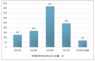 2016年我国磁粉探伤检测仪出口总量417台,2017年出口总量244台;2018年1季度出口总量70台。