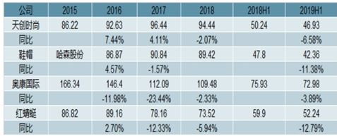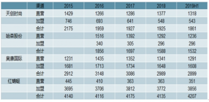 2019上半年,除红蜻蜓外,其余鞋帽行业大部分公司渠道数量减少,反映行业低迷情况下渠道仍在调整中。同时大部分公司2019年上半年终端销售继续面临较大压力,报表同店数据均出现不同幅度下滑,且较2019年进一步扩大。