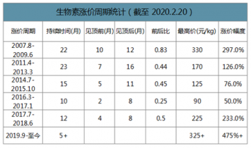 从2006年开始,生物素完整经历了5轮涨价周期,2019年10月是第6轮周期起点。生物素历史最高价是2008年的330元/kg,截至2月20日生物素价格325元/kg。