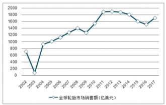 全球轮胎市场2002年销售额706亿美元,2017年增长至1700亿美元,年复合增长率6%。期间经历了两次波动,一是2009年的全球经济危机,二是2012年之后大宗能源化工商品的下降周期,在2016年触底反弹。