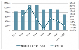 2011-2018年轮胎行业产量及增长变化(单位:万条,%)