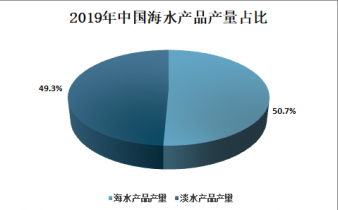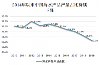 2014年来中国海水产品产量占比水产品产量持续下降,但占比基本维持在50%以上。2019年中国淡水产品产量占水产品产量的49.3%,海水产品产量占比为50.7%,较2014年相比下降1.4%。
