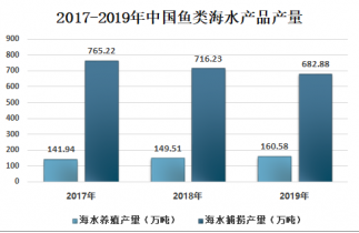 鱼类海水产品主要以捕捞为主,但近年来鱼类捕捞量呈缓慢下降的走势。2019年中国鱼类养殖产量为160.58万吨,捕捞产量为682.88万吨,捕捞产量为养殖产量的4.2倍。