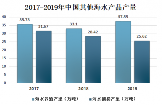 中国其他海水产品养殖量呈上升趋势,而捕捞量逐年下降。2019年中国其他海水产品养殖量为37.55万吨,较2018年增加4.45万吨;捕捞量为25.62万吨,较2018年减少2.8万吨。
