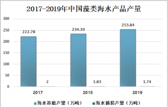 中国藻类海水产品捕捞量不仅占比小且捕捞量呈现逐年下降走势。2019年中国藻类捕捞量仅1.74万吨,较2018年较少0.9万吨。而2019年中国藻类养殖产量达到253.84万吨,较2018年增加19.45万吨。
